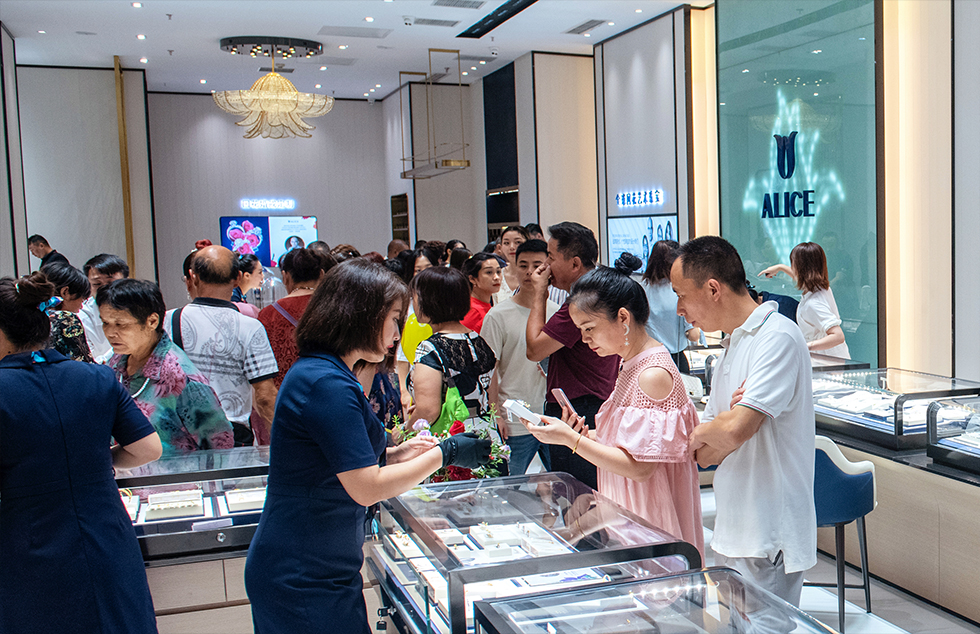 在众多国际一线品牌聚集的场内,ALICE爱丽丝珠宝依然门庭若市,160平米的超大体验店中站满了前来选购珠宝的顾客。各具风情的设计师珠宝以及爱丽丝独有的国花系列都收获了一众珠宝爱好者的喜爱,现场排队结账的队伍排到店面之外,场面异常火爆。