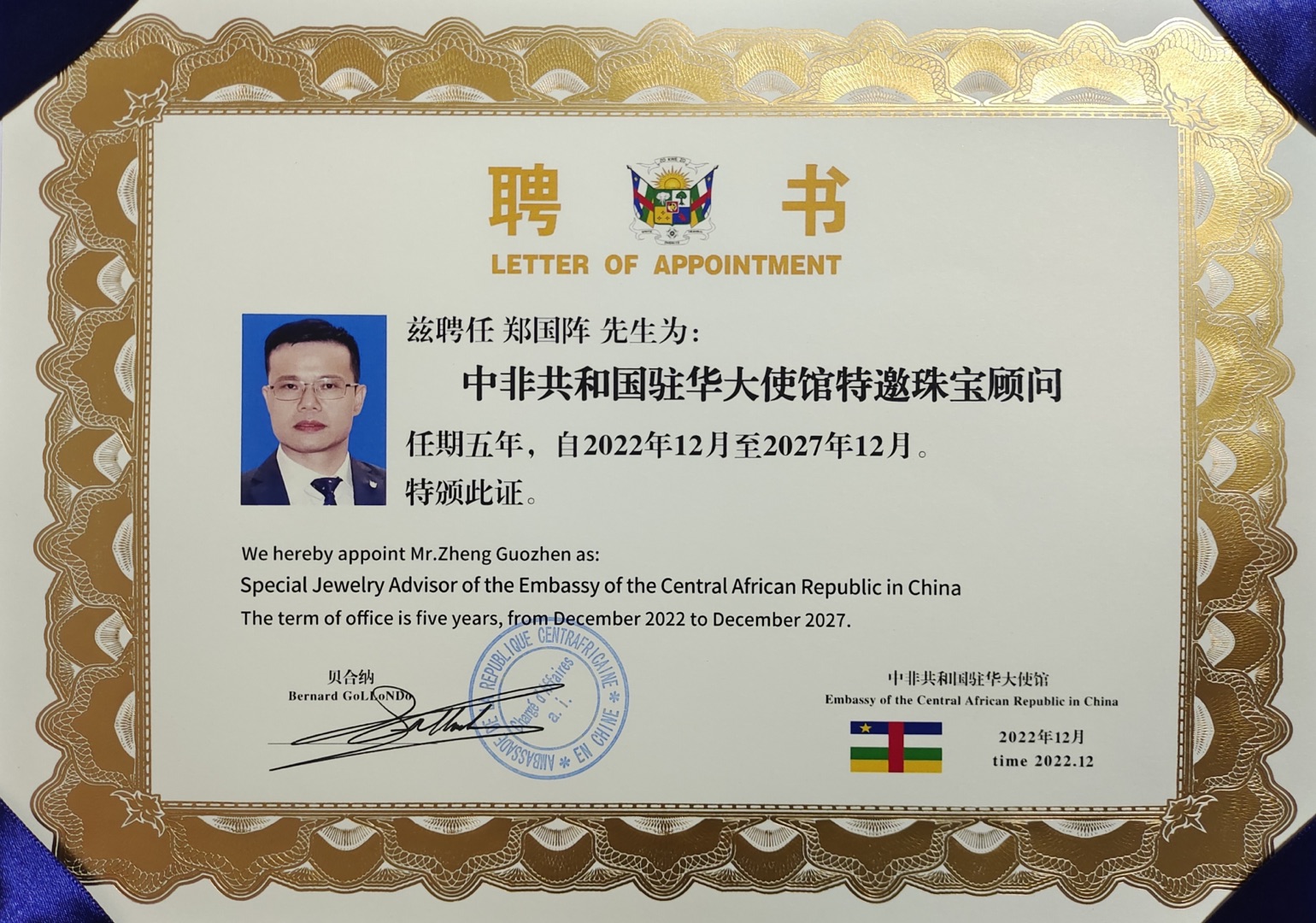 图2-爱丽丝珠宝集团董事长郑国阵先生为中非共和国驻华大使馆特邀珠宝顾问聘书