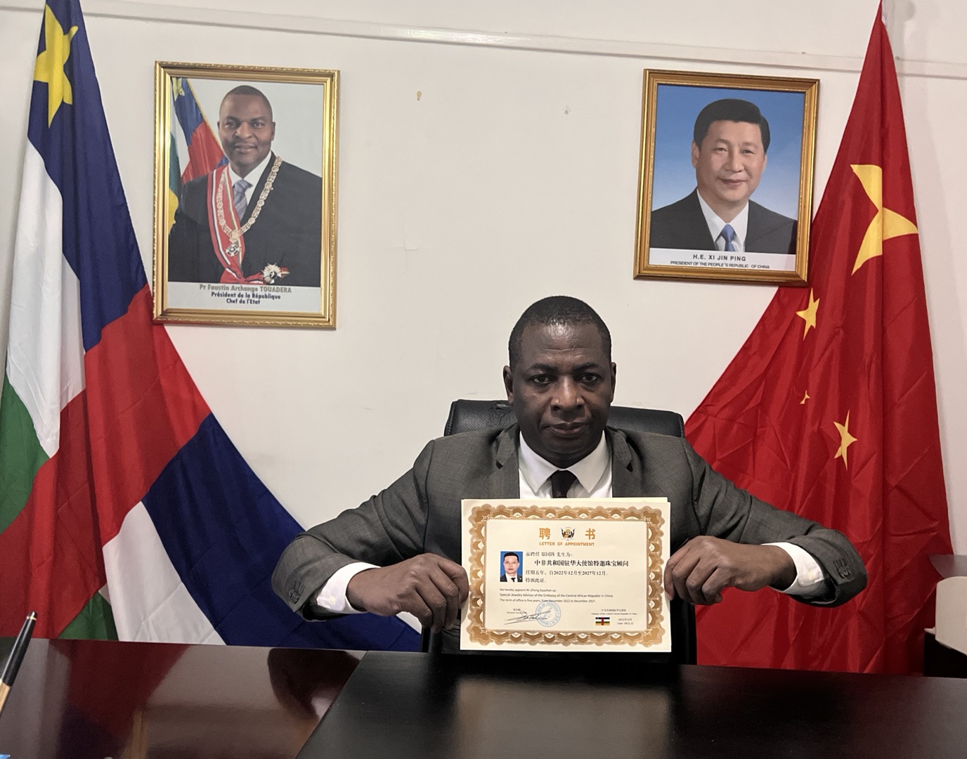 爱丽丝珠宝集团(香港)有限公司董事长郑国阵先生受聘为中非共和国驻华大使馆特邀珠宝顾问,聘书由中非共和国驻华大使贝合纳亲自颁发。